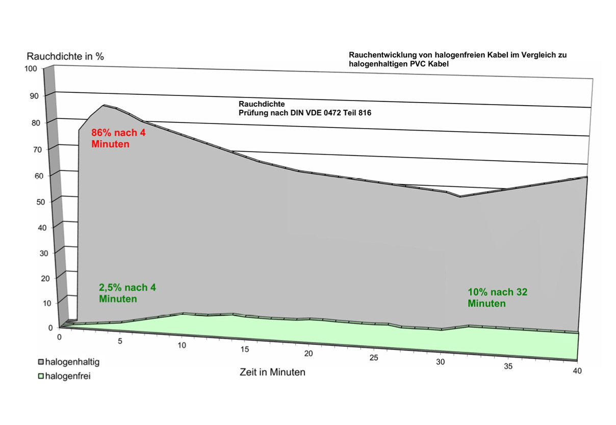 Ein kurzer Moment der Orientierungslosigkeit genügt, um in einer Gefahrensituation falsch abzubiegen. Brandrauch raubt die Sicht & macht orientierungslos. Vergleicht man die Rauchentwicklung herkömmlicher PVC-Kabel mit modernen, halogenfreien, flammwidrigen Kabeln, zeigt sich ein drastischer Unterschied: PVC erzeugt innerhalb kürzester Zeit über 80 % mehr Sichttrübung.