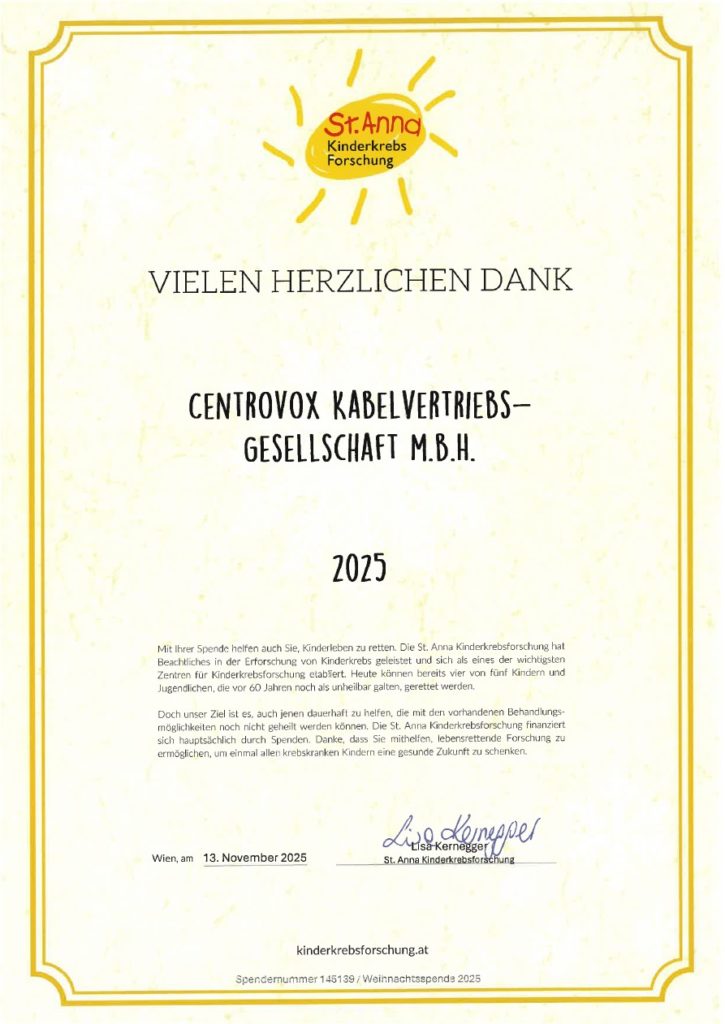 Die St. Anna Kinderkrebsforschung kämpft Tag für Tag dafür, jungen Patientinnen und Patienten bessere Heilungschancen zu ermöglichen. Dank ihrer Arbeit können heute vier von fünf Kindern und Jugendlichen gerettet werden. Ein Fortschritt, der Hoffnung, Mut und neue Zukunftsperspektiven schenkt. Wir sind dankbar, mit unserer Spende, einen kleinen Teil dazu beitragen zu können.