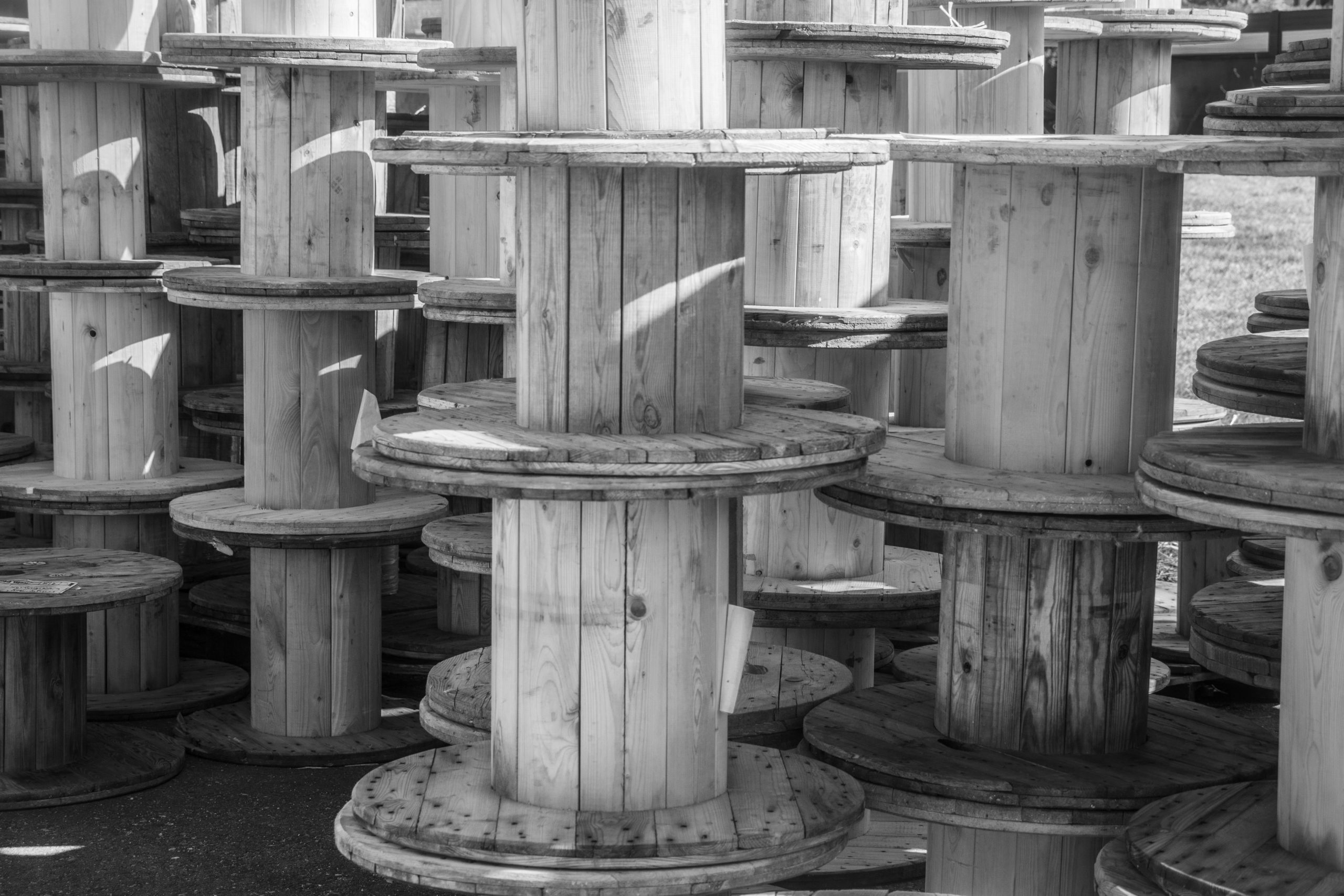 Ein Gebäude mit zehn Stockwerken, zahlreiche Kabeltrommeln und eine gleicht der anderen.