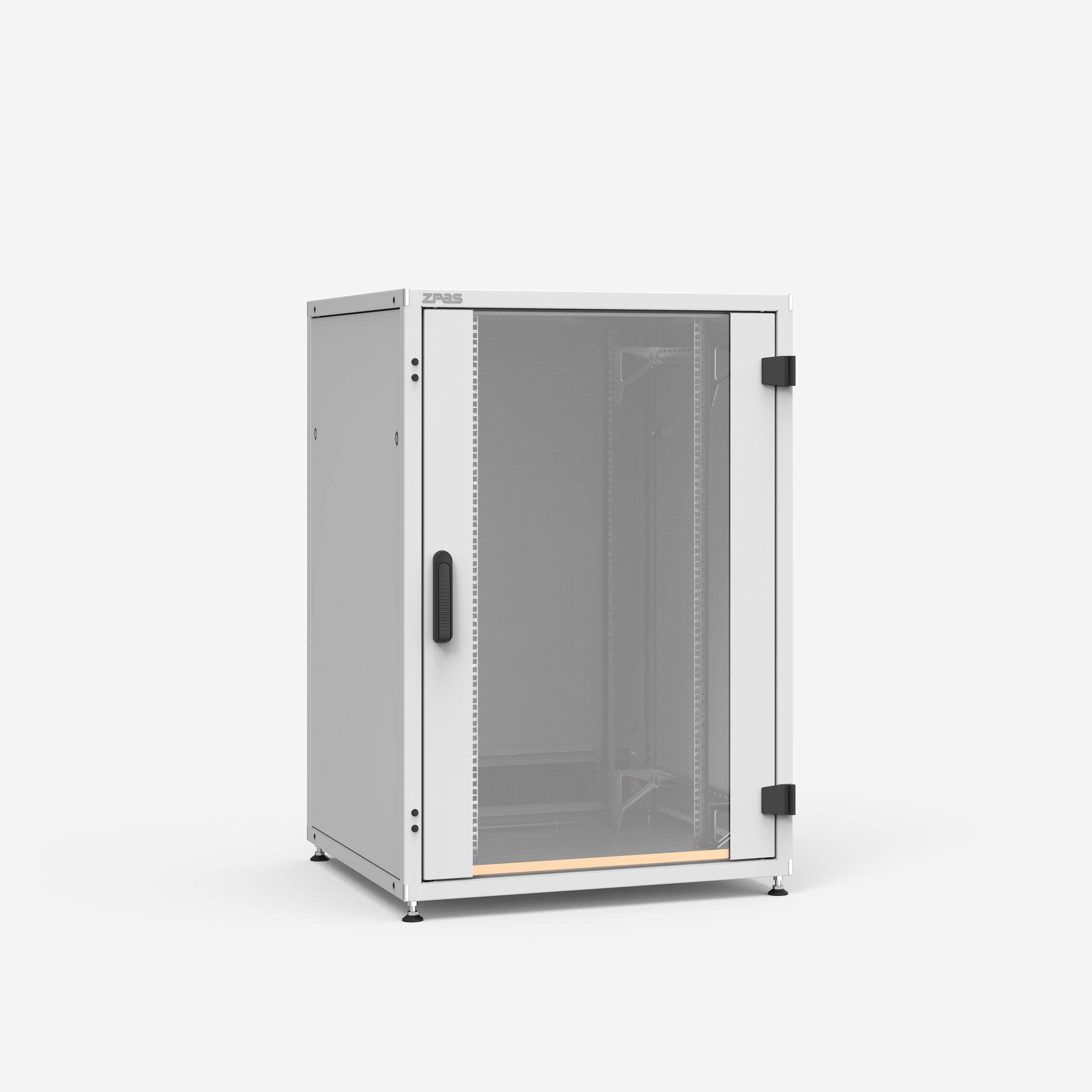 Netzwerkschrank: Gestell, Wände, Türe, Profilschienen, Tiefenstreben aus Stahlblech, Sichttür aus Stahlblech und farblosem Sicherheitsglas, Schutzart:IP 20 gemäß EN 60529, Gestell, Wände und Türe pulverbeschichtet (Grobstruktur), Profilschienen und Tiefenstreben Aluzink