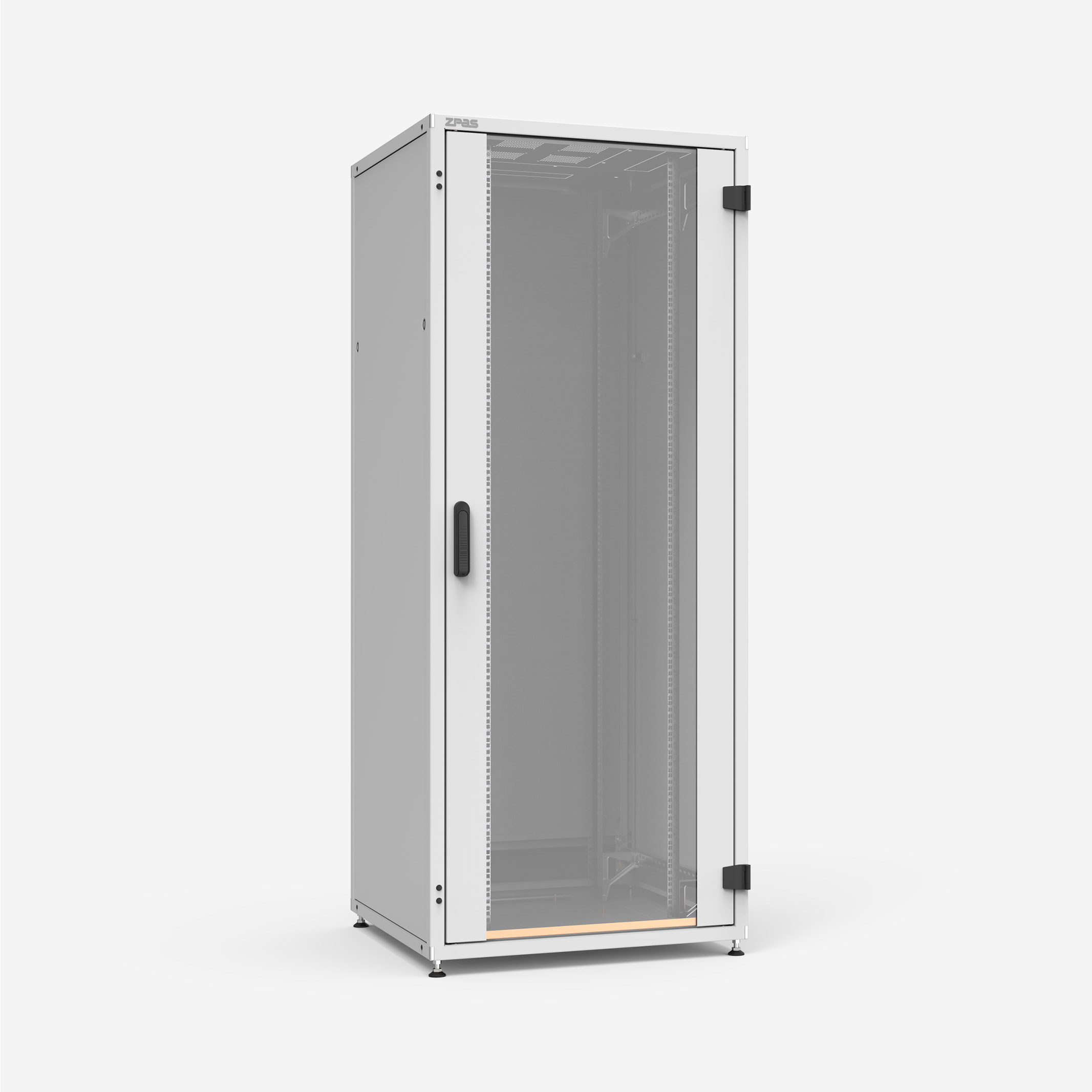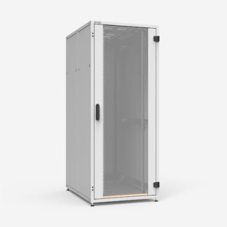 Netzwerkschrank: Gestell, Wände, Türe, Profilschienen, Tiefenstreben aus Stahlblech, Sichttür aus Stahlblech und farblosem Sicherheitsglas, Schutzart:IP 20 gemäß EN 60529, Gestell, Wände und Türe pulverbeschichtet (Grobstruktur), Profilschienen und Tiefenstreben Aluzink